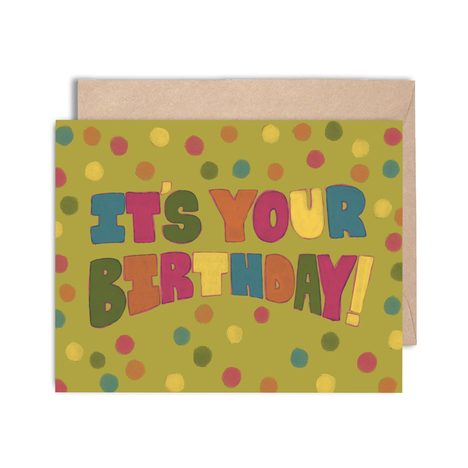Brighten any birthday with the Happy Birthday Dots Card! This playful greeting card features cheerful, colorful dots scattered across a vibrant green background, complemented by a hand-lettered "It's Your Birthday" message. Its lively design makes it the perfect way to celebrate and bring smiles on someone’s special day.