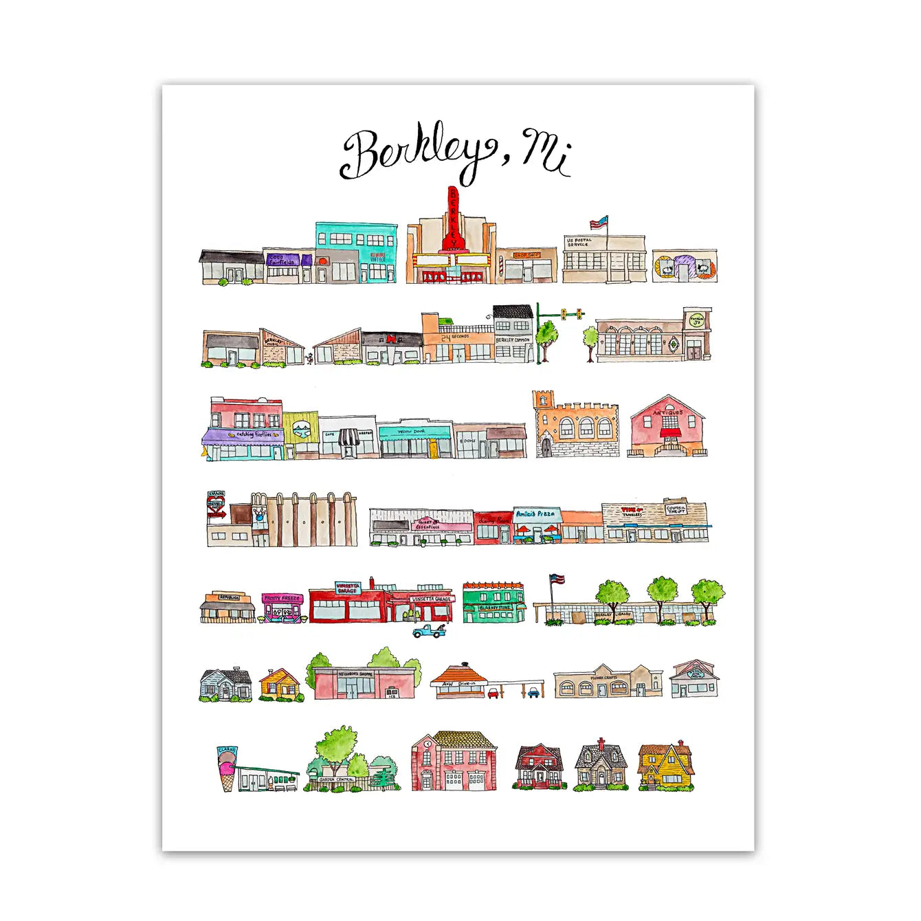 Capture the charm of the charming city of Berkley, Michigan with this unique art print illustration. Featuring iconic landmarks and local flair, this print is a must-have for any Michigan lover. Perfect for adding a touch of hometown pride to any space. (Pure Michigan vibes included!)