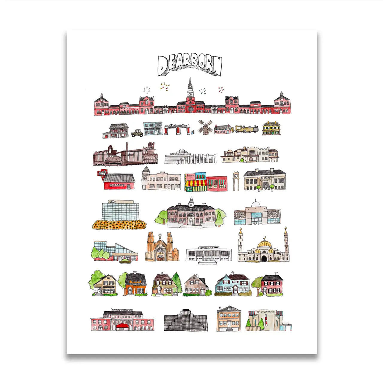 Welcome to Dearborn, Michigan- the land of the Ford Motor Company! This charming city portrait captures all the heart and spirit of this incredible place. Fun fact: did you know Dearborn is the only city in the world that can claim both the birth of a car company and a pizza company? Get your hands on this unique piece and show off your Motor City pride!