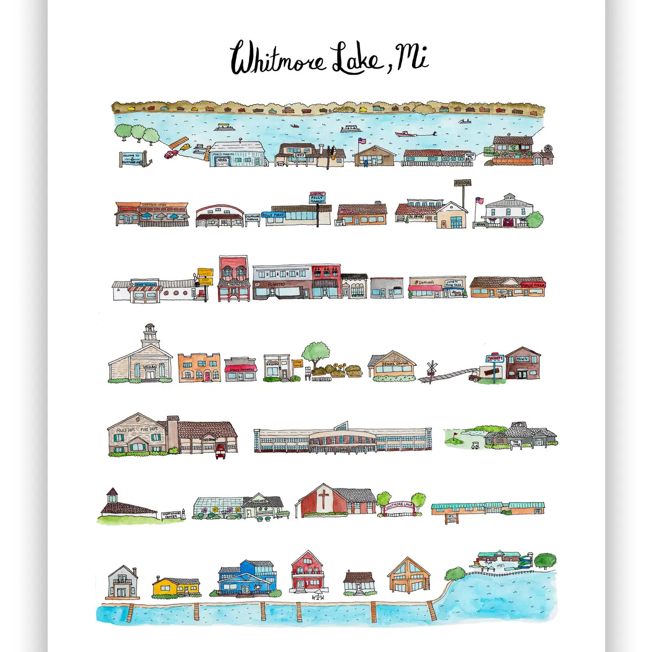 Take a trip to Whitmore Lake, Michigan with this eye-catching print! This quirky city portrait illustration makes it look like you can almost take a dive right in! Bring the vacation vibes to your living room. Ahoy there!