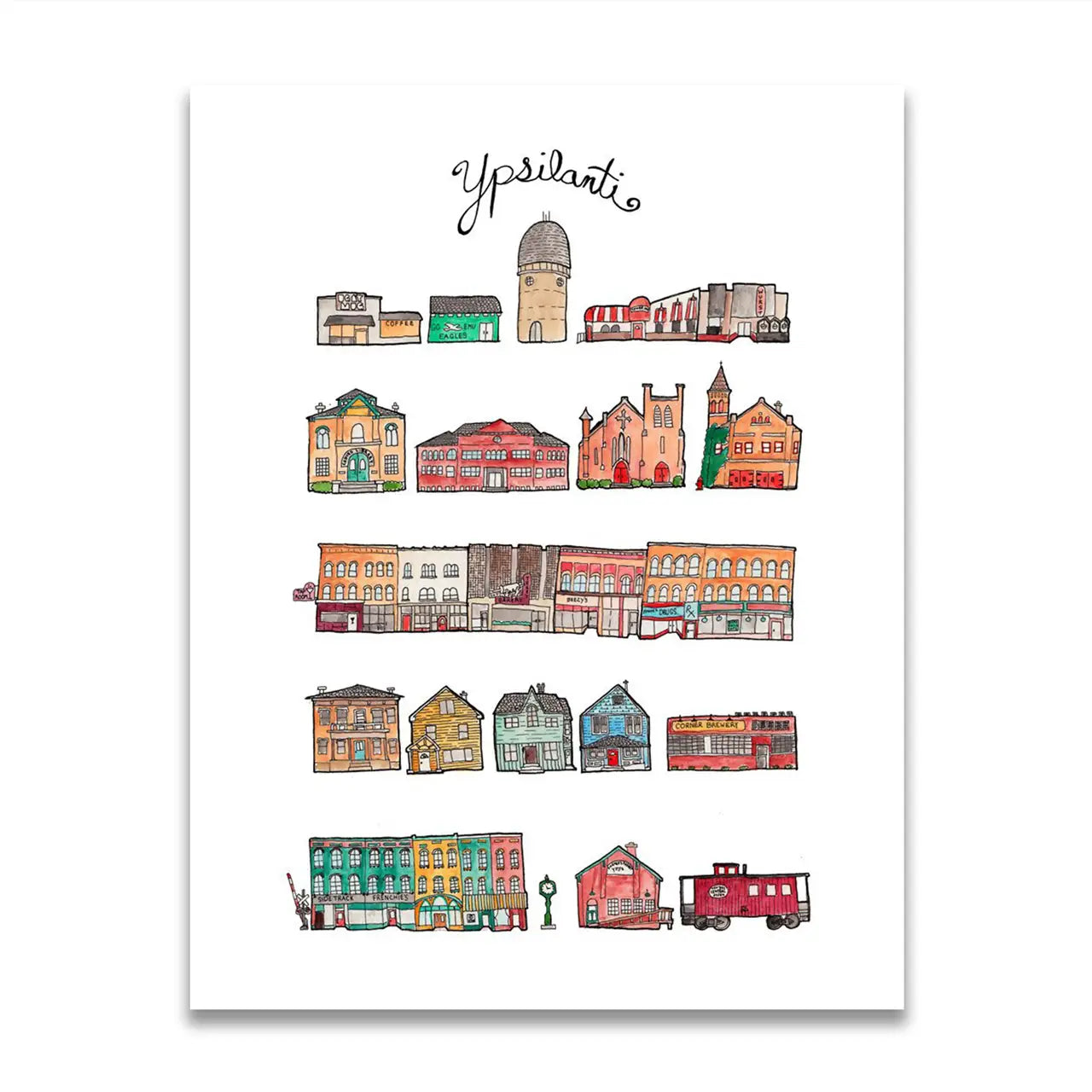 This Ypsilanti City Print is the perfect blend of art and nostalgia! Relive your favorite memories of Michigan with a fun drawing of the iconic Ypsilanti water tower and many of its familiar downtown sites. Hang it up and show off your hometown pride!