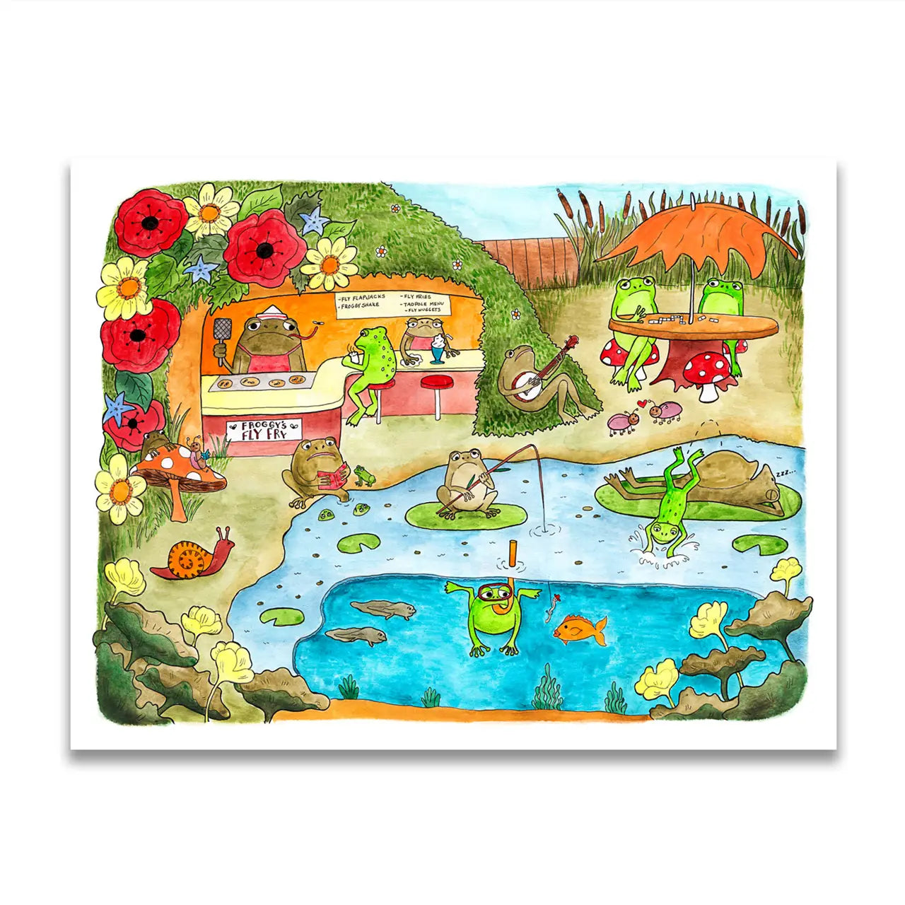 I recently was sitting at a diner and laughed to myself that everyone kinda looked like frogs. From that thought I was inspired to draw this illustration of the frog diner.