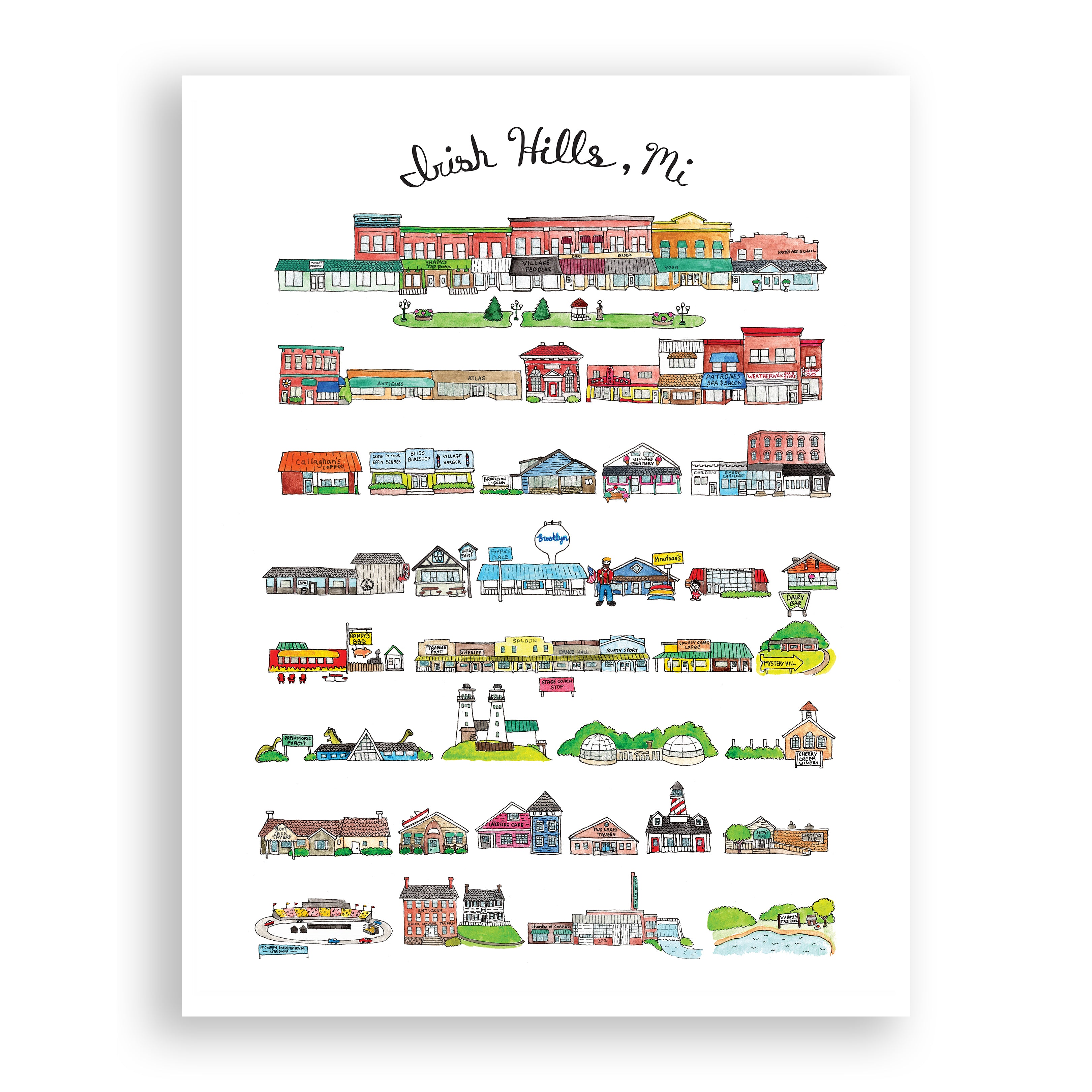 Discover the charming Irish Hills, Michigan with this playful print. Featuring an illustrated map of the area, including the famous stage coach stop and mystery hill. Add a touch of art to your space with this portrait-style print. Perfect for any Michigander or fan of quirky illustrations!