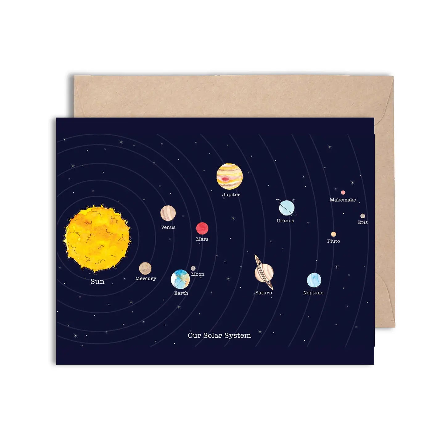 This stunning card features a hand-illustrated map of the solar system. Featuring all the planets: the Sun, Mercury, Venus, Earth, Mars, Jupiter, Saturn, Uranus, Neptune, Pluto, Makemake, and Eris, this greeting card is both informative and adorable. Send one to your astronomically inclined loved one today!